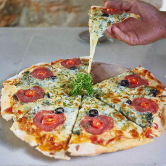 พิซซ่าแป้งสด ที่นวดโดยใช้มือและไม้นวดแป้ง ให้เป็นแผ่นกลมบาง ก่อนบรรจงทาซอสพิซซ่าสูตรบ้านไร่ฯ และ ใส่เครื่องหน้าตามออเดอร์ แบบสดใหม่ ถาดต่อถาด แล้วใส่เตาดิน อบให้มี Burn Mark แบบพอดีๆ เพื่อให้พิซซ่ามีกลิ่นหอม ขอบกรอบ ที่มีหน้าให้เลือกกว่า 12 หน้า